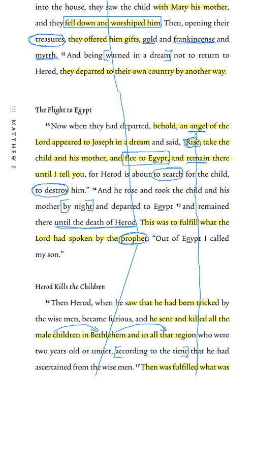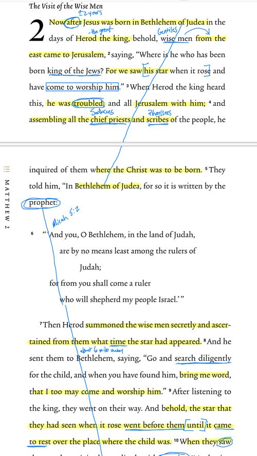 They comply and make their way to Bethlehem. Bethlehem is only about six miles away, but no one went with the Magi to see if God's Messiah had arrived. God wields the heavens, and the star they had seen returned and went before them, guiding them to the King. Filled with joy, they come to the house and worship Jesus. They give him their treasures and wonder at what they are experiencing. Mary and Joseph have seen many miraculous things because of their miracle son, but they must have been surprised to see these strangers from the east arrive and worship the King of the Jews they have been seeking. When they finish their visit, they are warned in a dream not to return to Herod and to travel home by a different route.