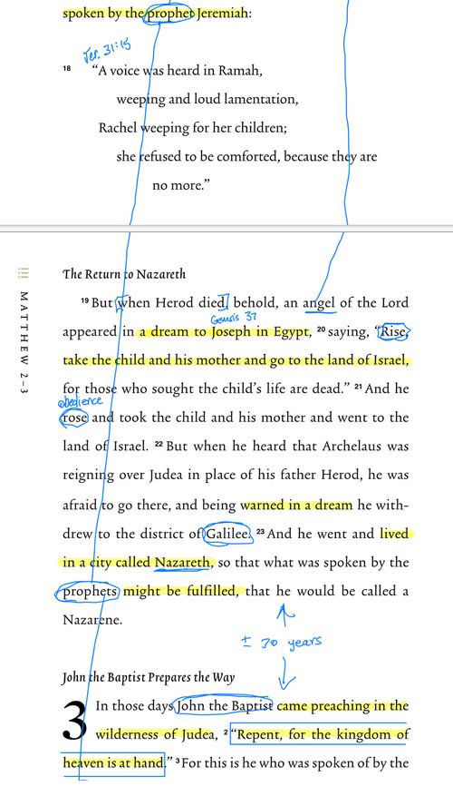 Matthew shifts quickly to Jesus' adulthood, passing almost thirty years between chapters 2 and 3. Jesus' cousin John preceded Him in the public eye, fulfilling the prophecies that one like Elijah would come to prepare the way for the Christ. He is known as "the Baptist" because he called Jews to repent of their sins and demonstrate their faith by immersion in water, a rite otherwise primarily reserved for Gentile proselytes to Judaism.
