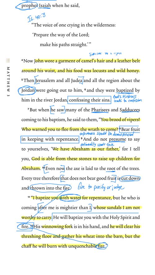 John's appearance was rough, and he shared similarities between himself and Elijah. Some people began to wonder if God had finally broken his silence after four hundred years. John did not mince words, drew attention to his intensity, and his message captured the people's attention. John explains that fruit is the evidence of repentance, and those that do not bear such fruit must expect judgment and condemnation. His call to repentance is one of water, but he explains that the one coming would "baptize them with the Holy Spirit and fire." He declares that the one to come after him was so great that he was not even worthy of being his servant. The message is blunt, but the servant is humble. God is a consuming fire, and he must act resolutely toward sin.