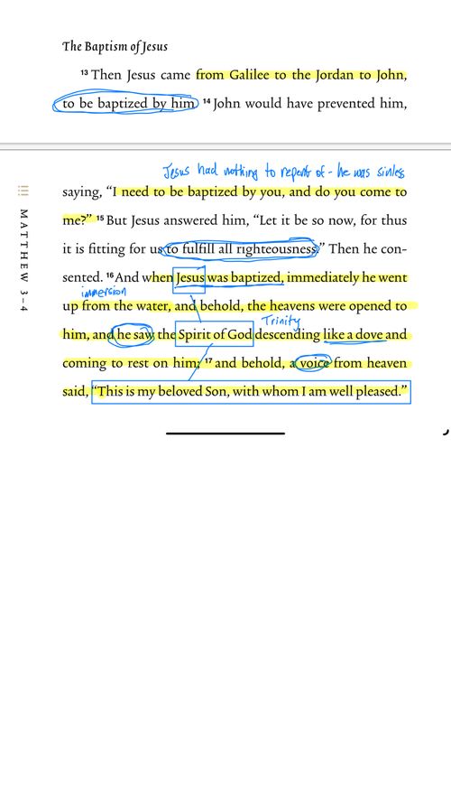 John is resistant to Jesus' request for baptism because he recognizes Jesus' authority and mission. Jesus explains that his baptism was different than others because He had no sins to confess, but it will fulfill righteousness. John submits and baptizes Jesus. As Jesus comes up from the water, the three persons of the Godhead manifest themselves in this incredible moment. A voice speaks from heaven. It is the voice of the Father from heaven to his beloved Son.