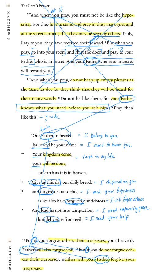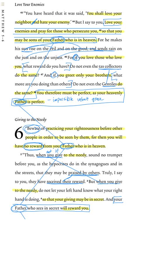 “It was also said, ‘Whoever divorces his wife, let him give her a certificate of divorce.’ But I say to you that everyone who divorces his wife, except on the ground of sexual immorality, makes her commit adultery, and whoever marries a divorced woman commits adultery. “Again you have heard that it was said to those of old, ‘You shall not swear falsely, but shall perform to the Lord what you have sworn.’ But I say to you, Do not take an oath at all, either by heaven, for it is the throne of God, or by the earth, for it is his footstool, or by Jerusalem, for it is the city of the great King. And do not take an oath by your head, for you cannot make one hair white or black. Let what you say be simply ‘Yes’ or ‘No’; anything more than this comes from evil. “You have heard that it was said, ‘An eye for an eye and a tooth for a tooth.’ But I say to you, Do not resist the one who is evil. But if anyone slaps you on the right cheek, turn to him the other also. And if anyone would sue you and take your tunic, let him have your cloak as well. And if anyone forces you to go one mile, go with him two miles. Give to the one who begs from you, and do not refuse the one who would borrow from you. “You have heard that it was said, ‘You shall love your neighbor and hate your enemy.’ But I say to you, Love your enemies and pray for those who persecute you, so that you may be sons of your Father who is in heaven. For he makes his sun rise on the evil and on the good, and sends rain on the just and on the unjust. For if you love those who love you, what reward do you have? Do not even the tax collectors do the same? And if you greet only your brothers, what more are you doing than others? Do not even the Gentiles do the same? You therefore must be perfect, as your heavenly Father is perfect. “Beware of practicing your righteousness before other people in order to be seen by them, for then you will have no reward from your Father who is in heaven. “Thus, when you give to the needy, sound no trumpet before you, as the hypocrites do in the synagogues and in the streets, that they may be praised by others. Truly, I say to you, they have received their reward. But when you give to the needy, do not let your left hand know what your right hand is doing, so that your giving may be in secret. And your Father who sees in secret will reward you. “And when you pray, you must not be like the hypocrites. For they love to stand and pray in the synagogues and at the street corners, that they may be seen by others. Truly, I say to you, they have received their reward. But when you pray, go into your room and shut the door and pray to your Father who is in secret. And your Father who sees in secret will reward you. “And when you pray, do not heap up empty phrases as the Gentiles do, for they think that they will be heard for their many words. Do not be like them, for your Father knows what you need before you ask him. Pray then like this: “Our Father in heaven, hallowed be your name. Your kingdom come, your will be done, on earth as it is in heaven. Give us this day our daily bread, and forgive us our debts, as we also have forgiven our debtors. And lead us not into temptation, but deliver us from evil. For if you forgive others their trespasses, your heavenly Father will also forgive you, but if you do not forgive others their trespasses, neither will your Father forgive your trespasses.” (Matthew 5:31–6:15, ESV)