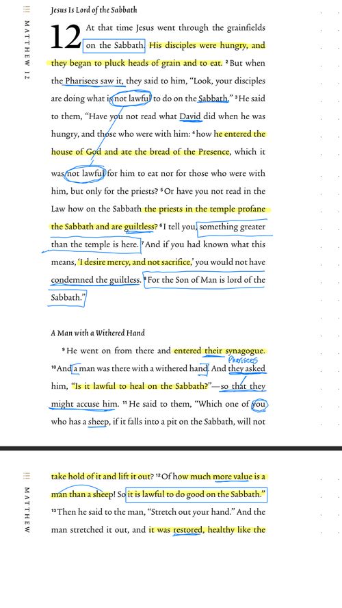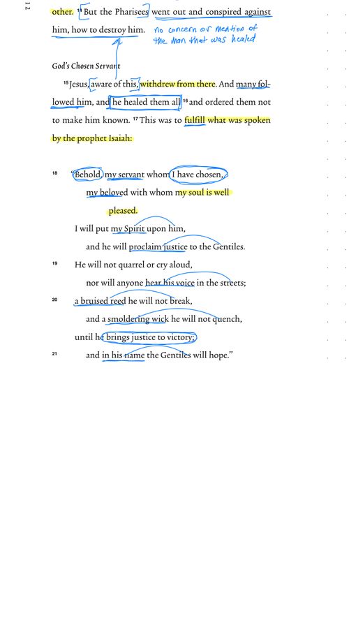 “Then he began to denounce the cities where most of his mighty works had been done, because they did not repent. “Woe to you, Chorazin! Woe to you, Bethsaida! For if the mighty works done in you had been done in Tyre and Sidon, they would have repented long ago in sackcloth and ashes. But I tell you, it will be more bearable on the day of judgment for Tyre and Sidon than for you. And you, Capernaum, will you be exalted to heaven? You will be brought down to Hades. For if the mighty works done in you had been done in Sodom, it would have remained until this day. But I tell you that it will be more tolerable on the day of judgment for the land of Sodom than for you.” At that time Jesus declared, “I thank you, Father, Lord of heaven and earth, that you have hidden these things from the wise and understanding and revealed them to little children; yes, Father, for such was your gracious will. All things have been handed over to me by my Father, and no one knows the Son except the Father, and no one knows the Father except the Son and anyone to whom the Son chooses to reveal him. Come to me, all who labor and are heavy laden, and I will give you rest. Take my yoke upon you, and learn from me, for I am gentle and lowly in heart, and you will find rest for your souls. For my yoke is easy, and my burden is light.” At that time Jesus went through the grainfields on the Sabbath. His disciples were hungry, and they began to pluck heads of grain and to eat. But when the Pharisees saw it, they said to him, “Look, your disciples are doing what is not lawful to do on the Sabbath.” He said to them, “Have you not read what David did when he was hungry, and those who were with him: how he entered the house of God and ate the bread of the Presence, which it was not lawful for him to eat nor for those who were with him, but only for the priests? Or have you not read in the Law how on the Sabbath the priests in the temple profane the Sabbath and are guiltless? I tell you, something greater than the temple is here. And if you had known what this means, ‘I desire mercy, and not sacrifice,’ you would not have condemned the guiltless. For the Son of Man is lord of the Sabbath.” He went on from there and entered their synagogue. And a man was there with a withered hand. And they asked him, “Is it lawful to heal on the Sabbath?”—so that they might accuse him. He said to them, “Which one of you who has a sheep, if it falls into a pit on the Sabbath, will not take hold of it and lift it out? Of how much more value is a man than a sheep! So it is lawful to do good on the Sabbath.” Then he said to the man, “Stretch out your hand.” And the man stretched it out, and it was restored, healthy like the other. But the Pharisees went out and conspired against him, how to destroy him. Jesus, aware of this, withdrew from there. And many followed him, and he healed them all and ordered them not to make him known. This was to fulfill what was spoken by the prophet Isaiah: “Behold, my servant whom I have chosen, my beloved with whom my soul is well pleased. I will put my Spirit upon him, and he will proclaim justice to the Gentiles. He will not quarrel or cry aloud, nor will anyone hear his voice in the streets; a bruised reed he will not break, and a smoldering wick he will not quench, until he brings justice to victory; and in his name the Gentiles will hope.” (Matthew 11:20–12:21, ESV)