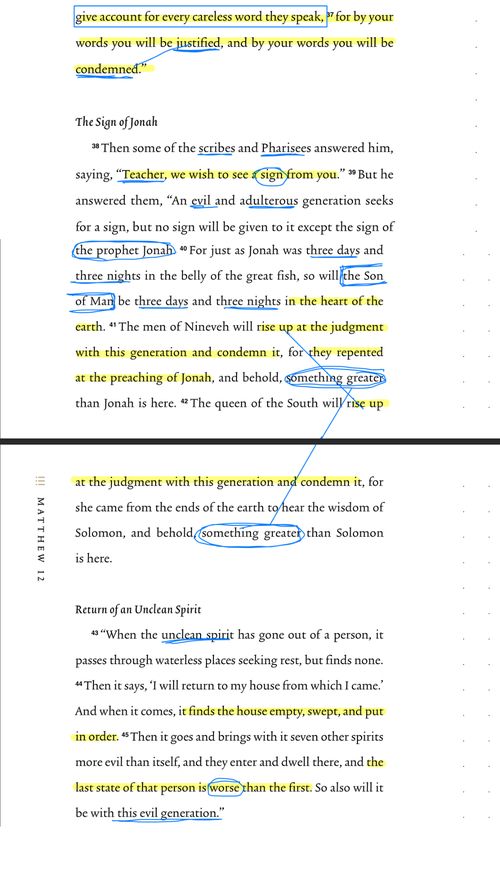 The scribes and Pharisees demanded a sign, but God would not be domesticated. Jesus did not owe them anything and had already delivered sign after sign. Jesus told them that the only sign they would receive was the sign of Jonah. Jesus' statements about Jonah indicated that the Book of Jonah was not a legend or fable but a historical fact and that it pointed to his descent into death. By referencing Jonah, Jesus highlights the contrast between Nineveh's people, who repented after hearing Jonah's sermon, and Jesus' own generation, who has yet to repent despite having someone even greater than Jonah. Jesus reemphasizes the same point in his comparison to Solomon. The Queen of Sheba traversed a long journey simply for an audience with Solomon, yet people show minimal enthusiasm towards David's greater descendant. Similarly, His reference to an unclean spirit returning suggests He is cautioning them about the consequences of rejecting Him.