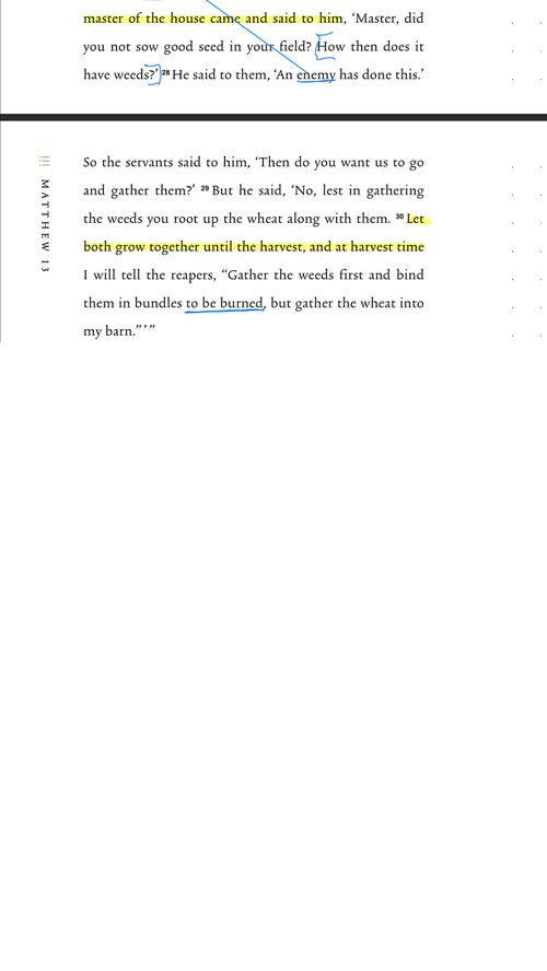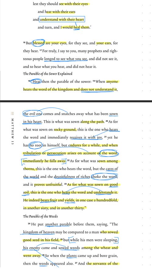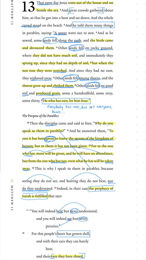 “That same day Jesus went out of the house and sat beside the sea. And great crowds gathered about him, so that he got into a boat and sat down. And the whole crowd stood on the beach. And he told them many things in parables, saying: “A sower went out to sow. And as he sowed, some seeds fell along the path, and the birds came and devoured them. Other seeds fell on rocky ground, where they did not have much soil, and immediately they sprang up, since they had no depth of soil, but when the sun rose they were scorched. And since they had no root, they withered away. Other seeds fell among thorns, and the thorns grew up and choked them. Other seeds fell on good soil and produced grain, some a hundredfold, some sixty, some thirty. He who has ears, let him hear.” Then the disciples came and said to him, “Why do you speak to them in parables?” And he answered them, “To you it has been given to know the secrets of the kingdom of heaven, but to them it has not been given. For to the one who has, more will be given, and he will have an abundance, but from the one who has not, even what he has will be taken away. This is why I speak to them in parables, because seeing they do not see, and hearing they do not hear, nor do they understand. Indeed, in their case the prophecy of Isaiah is fulfilled that says: “ ‘ “You will indeed hear but never understand, and you will indeed see but never perceive.” For this people’s heart has grown dull, and with their ears they can barely hear, and their eyes they have closed, lest they should see with their eyes and hear with their ears and understand with their heart and turn, and I would heal them.’ But blessed are your eyes, for they see, and your ears, for they hear. For truly, I say to you, many prophets and righteous people longed to see what you see, and did not see it, and to hear what you hear, and did not hear it. “Hear then the parable of the sower: When anyone hears the word of the kingdom and does not understand it, the evil one comes and snatches away what has been sown in his heart. This is what was sown along the path. As for what was sown on rocky ground, this is the one who hears the word and immediately receives it with joy, yet he has no root in himself, but endures for a while, and when tribulation or persecution arises on account of the word, immediately he falls away. As for what was sown among thorns, this is the one who hears the word, but the cares of the world and the deceitfulness of riches choke the word, and it proves unfruitful. As for what was sown on good soil, this is the one who hears the word and understands it. He indeed bears fruit and yields, in one case a hundredfold, in another sixty, and in another thirty.” He put another parable before them, saying, “The kingdom of heaven may be compared to a man who sowed good seed in his field, but while his men were sleeping, his enemy came and sowed weeds among the wheat and went away. So when the plants came up and bore grain, then the weeds appeared also. And the servants of the master of the house came and said to him, ‘Master, did you not sow good seed in your field? How then does it have weeds?’ He said to them, ‘An enemy has done this.’ So the servants said to him, ‘Then do you want us to go and gather them?’ But he said, ‘No, lest in gathering the weeds you root up the wheat along with them. Let both grow together until the harvest, and at harvest time I will tell the reapers, “Gather the weeds first and bind them in bundles to be burned, but gather the wheat into my barn.”