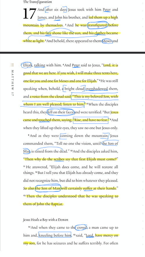 “And after six days Jesus took with him Peter and James, and John his brother, and led them up a high mountain by themselves. And he was transfigured before them, and his face shone like the sun, and his clothes became white as light. And behold, there appeared to them Moses and Elijah, talking with him. And Peter said to Jesus, “Lord, it is good that we are here. If you wish, I will make three tents here, one for you and one for Moses and one for Elijah.” He was still speaking when, behold, a bright cloud overshadowed them, and a voice from the cloud said, “This is my beloved Son, with whom I am well pleased; listen to him.” When the disciples heard this, they fell on their faces and were terrified. But Jesus came and touched them, saying, “Rise, and have no fear.” And when they lifted up their eyes, they saw no one but Jesus only. And as they were coming down the mountain, Jesus commanded them, “Tell no one the vision, until the Son of Man is raised from the dead.” And the disciples asked him, “Then why do the scribes say that first Elijah must come?” He answered, “Elijah does come, and he will restore all things. But I tell you that Elijah has already come, and they did not recognize him, but did to him whatever they pleased. So also the Son of Man will certainly suffer at their hands.” Then the disciples understood that he was speaking to them of John the Baptist. And when they came to the crowd, a man came up to him and, kneeling before him, said, “Lord, have mercy on my son, for he has seizures and he suffers terribly. For often he falls into the fire, and often into the water. And I brought him to your disciples, and they could not heal him.” And Jesus answered, “O faithless and twisted generation, how long am I to be with you? How long am I to bear with you? Bring him here to me.” And Jesus rebuked the demon, and it came out of him, and the boy was healed instantly. Then the disciples came to Jesus privately and said, “Why could we not cast it out?” He said to them, “Because of your little faith. For truly, I say to you, if you have faith like a grain of mustard seed, you will say to this mountain, ‘Move from here to there,’ and it will move, and nothing will be impossible for you.” As they were gathering in Galilee, Jesus said to them, “The Son of Man is about to be delivered into the hands of men, and they will kill him, and he will be raised on the third day.” And they were greatly distressed. When they came to Capernaum, the collectors of the two-drachma tax went up to Peter and said, “Does your teacher not pay the tax?” He said, “Yes.” And when he came into the house, Jesus spoke to him first, saying, “What do you think, Simon? From whom do kings of the earth take toll or tax? From their sons or from others?” And when he said, “From others,” Jesus said to him, “Then the sons are free. However, not to give offense to them, go to the sea and cast a hook and take the first fish that comes up, and when you open its mouth you will find a shekel. Take that and give it to them for me and for yourself.”