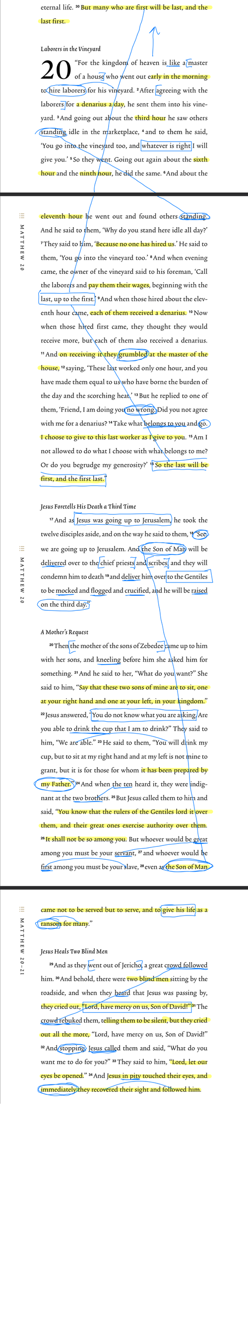 ““For the kingdom of heaven is like a master of a house who went out early in the morning to hire laborers for his vineyard. After agreeing with the laborers for a denarius a day, he sent them into his vineyard. And going out about the third hour he saw others standing idle in the marketplace, and to them he said, ‘You go into the vineyard too, and whatever is right I will give you.’ So they went. Going out again about the sixth hour and the ninth hour, he did the same. And about the eleventh hour he went out and found others standing. And he said to them, ‘Why do you stand here idle all day?’ They said to him, ‘Because no one has hired us.’ He said to them, ‘You go into the vineyard too.’ And when evening came, the owner of the vineyard said to his foreman, ‘Call the laborers and pay them their wages, beginning with the last, up to the first.’ And when those hired about the eleventh hour came, each of them received a denarius. Now when those hired first came, they thought they would receive more, but each of them also received a denarius. And on receiving it they grumbled at the master of the house, saying, ‘These last worked only one hour, and you have made them equal to us who have borne the burden of the day and the scorching heat.’ But he replied to one of them, ‘Friend, I am doing you no wrong. Did you not agree with me for a denarius? Take what belongs to you and go. I choose to give to this last worker as I give to you. Am I not allowed to do what I choose with what belongs to me? Or do you begrudge my generosity?’ So the last will be first, and the first last.” And as Jesus was going up to Jerusalem, he took the twelve disciples aside, and on the way he said to them, “See, we are going up to Jerusalem. And the Son of Man will be delivered over to the chief priests and scribes, and they will condemn him to death and deliver him over to the Gentiles to be mocked and flogged and crucified, and he will be raised on the third day.” Then the mother of the sons of Zebedee came up to him with her sons, and kneeling before him she asked him for something. And he said to her, “What do you want?” She said to him, “Say that these two sons of mine are to sit, one at your right hand and one at your left, in your kingdom.” Jesus answered, “You do not know what you are asking. Are you able to drink the cup that I am to drink?” They said to him, “We are able.” He said to them, “You will drink my cup, but to sit at my right hand and at my left is not mine to grant, but it is for those for whom it has been prepared by my Father.” And when the ten heard it, they were indignant at the two brothers. But Jesus called them to him and said, “You know that the rulers of the Gentiles lord it over them, and their great ones exercise authority over them. It shall not be so among you. But whoever would be great among you must be your servant, and whoever would be first among you must be your slave, even as the Son of Man came not to be served but to serve, and to give his life as a ransom for many.” And as they went out of Jericho, a great crowd followed him. And behold, there were two blind men sitting by the roadside, and when they heard that Jesus was passing by, they cried out, “Lord, have mercy on us, Son of David!” The crowd rebuked them, telling them to be silent, but they cried out all the more, “Lord, have mercy on us, Son of David!” And stopping, Jesus called them and said, “What do you want me to do for you?” They said to him, “Lord, let our eyes be opened.” And Jesus in pity touched their eyes, and immediately they recovered their sight and followed him.”