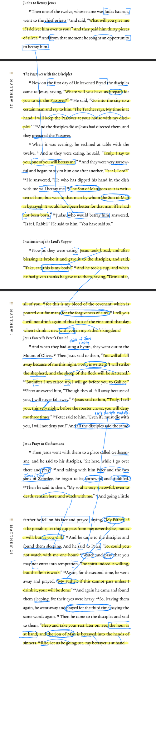 “Then one of the twelve, whose name was Judas Iscariot, went to the chief priests and said, “What will you give me if I deliver him over to you?” And they paid him thirty pieces of silver. And from that moment he sought an opportunity to betray him. Now on the first day of Unleavened Bread the disciples came to Jesus, saying, “Where will you have us prepare for you to eat the Passover?” He said, “Go into the city to a certain man and say to him, ‘The Teacher says, My time is at hand. I will keep the Passover at your house with my disciples.’ ” And the disciples did as Jesus had directed them, and they prepared the Passover. When it was evening, he reclined at table with the twelve. And as they were eating, he said, “Truly, I say to you, one of you will betray me.” And they were very sorrowful and began to say to him one after another, “Is it I, Lord?” He answered, “He who has dipped his hand in the dish with me will betray me. The Son of Man goes as it is written of him, but woe to that man by whom the Son of Man is betrayed! It would have been better for that man if he had not been born.” Judas, who would betray him, answered, “Is it I, Rabbi?” He said to him, “You have said so.” Now as they were eating, Jesus took bread, and after blessing it broke it and gave it to the disciples, and said, “Take, eat; this is my body.” And he took a cup, and when he had given thanks he gave it to them, saying, “Drink of it, all of you, for this is my blood of the covenant, which is poured out for many for the forgiveness of sins. I tell you I will not drink again of this fruit of the vine until that day when I drink it new with you in my Father’s kingdom.” And when they had sung a hymn, they went out to the Mount of Olives. Then Jesus said to them, “You will all fall away because of me this night. For it is written, ‘I will strike the shepherd, and the sheep of the flock will be scattered.’ But after I am raised up, I will go before you to Galilee.” Peter answered him, “Though they all fall away because of you, I will never fall away.” Jesus said to him, “Truly, I tell you, this very night, before the rooster crows, you will deny me three times.” Peter said to him, “Even if I must die with you, I will not deny you!” And all the disciples said the same. Then Jesus went with them to a place called Gethsemane, and he said to his disciples, “Sit here, while I go over there and pray.” And taking with him Peter and the two sons of Zebedee, he began to be sorrowful and troubled. Then he said to them, “My soul is very sorrowful, even to death; remain here, and watch with me.” And going a little farther he fell on his face and prayed, saying, “My Father, if it be possible, let this cup pass from me; nevertheless, not as I will, but as you will.” And he came to the disciples and found them sleeping. And he said to Peter, “So, could you not watch with me one hour? Watch and pray that you may not enter into temptation. The spirit indeed is willing, but the flesh is weak.” Again, for the second time, he went away and prayed, “My Father, if this cannot pass unless I drink it, your will be done.” And again he came and found them sleeping, for their eyes were heavy. So, leaving them again, he went away and prayed for the third time, saying the same words again. Then he came to the disciples and said to them, “Sleep and take your rest later on. See, the hour is at hand, and the Son of Man is betrayed into the hands of sinners. Rise, let us be going; see, my betrayer is at hand.””