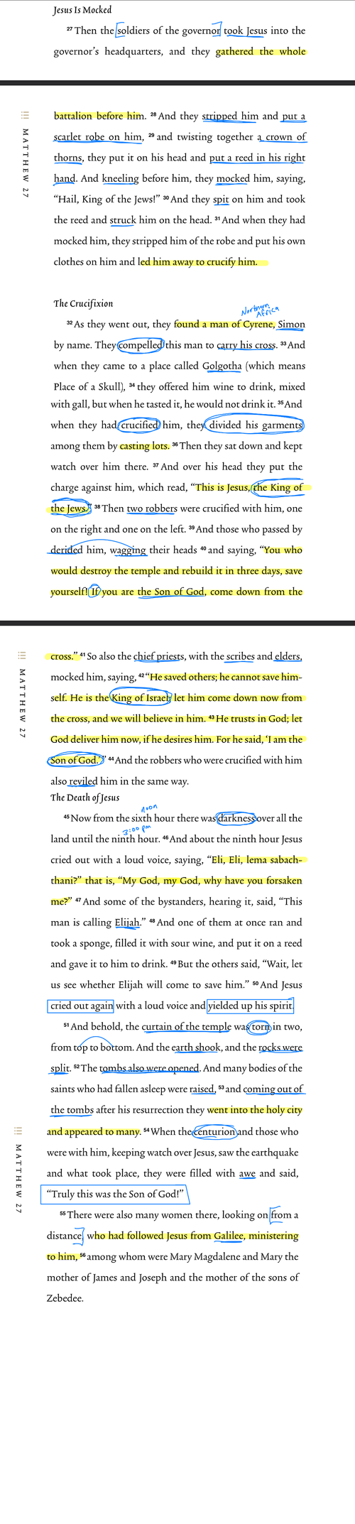 “Then the soldiers of the governor took Jesus into the governor’s headquarters, and they gathered the whole battalion before him. And they stripped him and put a scarlet robe on him, and twisting together a crown of thorns, they put it on his head and put a reed in his right hand. And kneeling before him, they mocked him, saying, “Hail, King of the Jews!” And they spit on him and took the reed and struck him on the head. And when they had mocked him, they stripped him of the robe and put his own clothes on him and led him away to crucify him. As they went out, they found a man of Cyrene, Simon by name. They compelled this man to carry his cross. And when they came to a place called Golgotha (which means Place of a Skull), they offered him wine to drink, mixed with gall, but when he tasted it, he would not drink it. And when they had crucified him, they divided his garments among them by casting lots. Then they sat down and kept watch over him there. And over his head they put the charge against him, which read, “This is Jesus, the King of the Jews.” Then two robbers were crucified with him, one on the right and one on the left. And those who passed by derided him, wagging their heads and saying, “You who would destroy the temple and rebuild it in three days, save yourself! If you are the Son of God, come down from the cross.” So also the chief priests, with the scribes and elders, mocked him, saying, “He saved others; he cannot save himself. He is the King of Israel; let him come down now from the cross, and we will believe in him. He trusts in God; let God deliver him now, if he desires him. For he said, ‘I am the Son of God.’ ” And the robbers who were crucified with him also reviled him in the same way. Now from the sixth hour there was darkness over all the land until the ninth hour. And about the ninth hour Jesus cried out with a loud voice, saying, “Eli, Eli, lema sabachthani?” that is, “My God, my God, why have you forsaken me?” And some of the bystanders, hearing it, said, “This man is calling Elijah.” And one of them at once ran and took a sponge, filled it with sour wine, and put it on a reed and gave it to him to drink. But the others said, “Wait, let us see whether Elijah will come to save him.” And Jesus cried out again with a loud voice and yielded up his spirit. And behold, the curtain of the temple was torn in two, from top to bottom. And the earth shook, and the rocks were split. The tombs also were opened. And many bodies of the saints who had fallen asleep were raised, and coming out of the tombs after his resurrection they went into the holy city and appeared to many. When the centurion and those who were with him, keeping watch over Jesus, saw the earthquake and what took place, they were filled with awe and said, “Truly this was the Son of God!” There were also many women there, looking on from a distance, who had followed Jesus from Galilee, ministering to him, among whom were Mary Magdalene and Mary the mother of James and Joseph and the mother of the sons of Zebedee.”