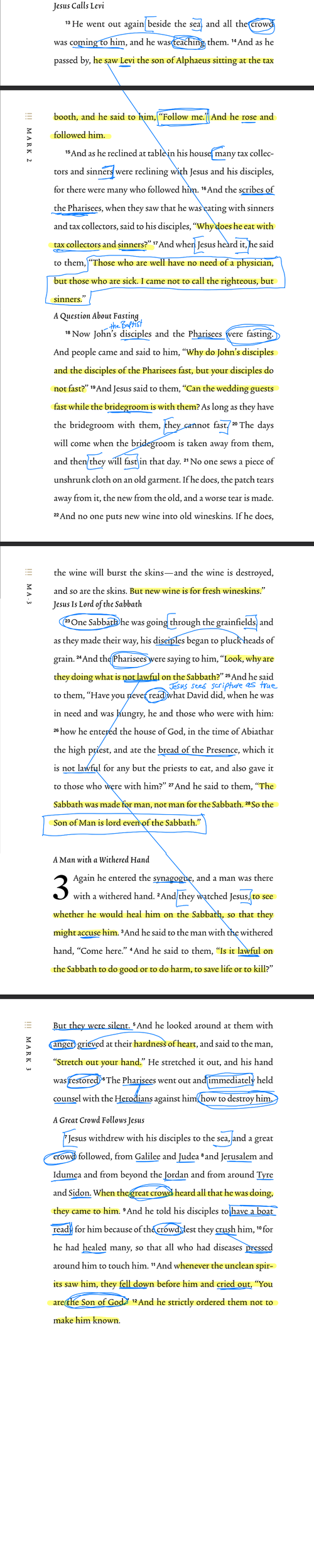 One Sabbath he was going through the grainfields, and as they made their way, his disciples began to pluck heads of grain. And the Pharisees were saying to him, “Look, why are they doing what is not lawful on the Sabbath?” And he said to them, “Have you never read what David did, when he was in need and was hungry, he and those who were with him: how he entered the house of God, in the time of Abiathar the high priest, and ate the bread of the Presence, which it is not lawful for any but the priests to eat, and also gave it to those who were with him?” And he said to them, “The Sabbath was made for man, not man for the Sabbath. So the Son of Man is lord even of the Sabbath.”
