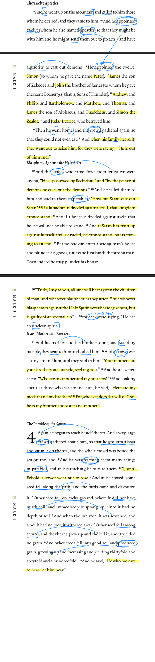 And he went up on the mountain and called to him those whom he desired, and they came to him. And he appointed twelve (whom he also named apostles) so that they might be with him and he might send them out to preach and have authority to cast out demons. He appointed the twelve: Simon (to whom he gave the name Peter); James the son of Zebedee and John the brother of James (to whom he gave the name Boanerges, that is, Sons of Thunder); Andrew, and Philip, and Bartholomew, and Matthew, and Thomas, and James the son of Alphaeus, and Thaddaeus, and Simon the Zealot, and Judas Iscariot, who betrayed him.