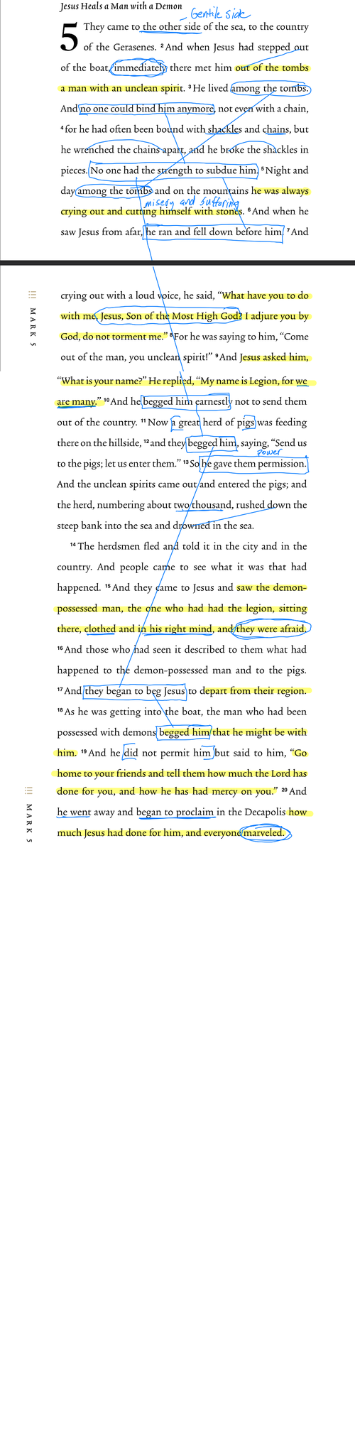 “They came to the other side of the sea, to the country of the Gerasenes. And when Jesus had stepped out of the boat, immediately there met him out of the tombs a man with an unclean spirit. He lived among the tombs. And no one could bind him anymore, not even with a chain, for he had often been bound with shackles and chains, but he wrenched the chains apart, and he broke the shackles in pieces. No one had the strength to subdue him. Night and day among the tombs and on the mountains he was always crying out and cutting himself with stones. And when he saw Jesus from afar, he ran and fell down before him. And crying out with a loud voice, he said, “What have you to do with me, Jesus, Son of the Most High God? I adjure you by God, do not torment me.” For he was saying to him, “Come out of the man, you unclean spirit!” And Jesus asked him, “What is your name?” He replied, “My name is Legion, for we are many.” And he begged him earnestly not to send them out of the country. Now a great herd of pigs was feeding there on the hillside, and they begged him, saying, “Send us to the pigs; let us enter them.” So he gave them permission. And the unclean spirits came out and entered the pigs; and the herd, numbering about two thousand, rushed down the steep bank into the sea and drowned in the sea. The herdsmen fled and told it in the city and in the country. And people came to see what it was that had happened. And they came to Jesus and saw the demon-possessed man, the one who had had the legion, sitting there, clothed and in his right mind, and they were afraid. And those who had seen it described to them what had happened to the demon-possessed man and to the pigs. And they began to beg Jesus to depart from their region. As he was getting into the boat, the man who had been possessed with demons begged him that he might be with him. And he did not permit him but said to him, “Go home to your friends and tell them how much the Lord has done for you, and how he has had mercy on you.” And he went away and began to proclaim in the Decapolis how much Jesus had done for him, and everyone marveled.”