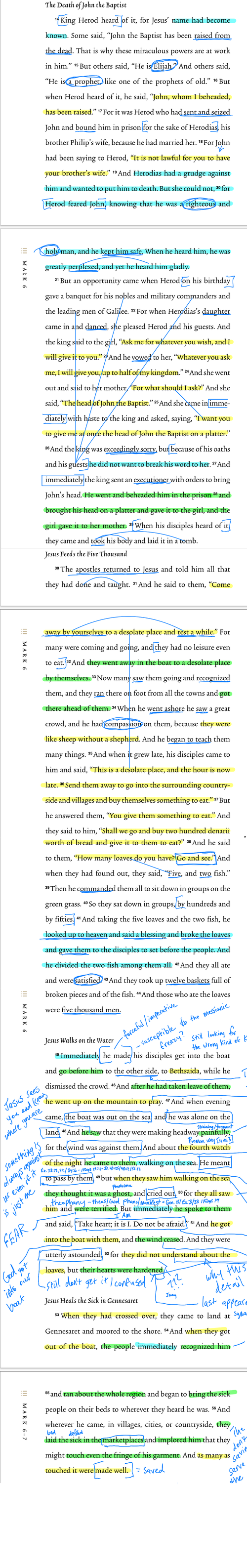30 The apostles returned to Jesus and told him all that they had done and taught. 31 And he said to them, “Come away by yourselves to a desolate place and rest a while.” For many were coming and going, and they had no leisure even to eat. 32 And they went away in the boat to a desolate place by themselves. 33 Now many saw them going and recognized them, and they ran there on foot from all the towns and got there ahead of them. 34 When he went ashore he saw a great crowd, and he had compassion on them, because they were like sheep without a shepherd. And he began to teach them many things. 35 And when it grew late, his disciples came to him and said, “This is a desolate place, and the hour is now late. 36 Send them away to go into the surrounding countryside and villages and buy themselves something to eat.” 37 But he answered them, “You give them something to eat.” And they said to him, “Shall we go and buy two hundred denarii worth of bread and give it to them to eat?” 38 And he said to them, “How many loaves do you have? Go and see.” And when they had found out, they said, “Five, and two fish.” 39 Then he commanded them all to sit down in groups on the green grass. 40 So they sat down in groups, by hundreds and by fifties. 41 And taking the five loaves and the two fish, he looked up to heaven and said a blessing and broke the loaves and gave them to the disciples to set before the people. And he divided the two fish among them all. 42 And they all ate and were satisfied. 43 And they took up twelve baskets full of broken pieces and of the fish. 44 And those who ate the loaves were five thousand men.