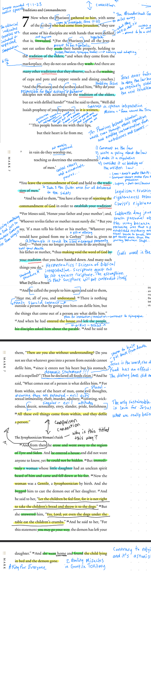 7 Now when the Pharisees gathered to him, with some of the scribes who had come from Jerusalem, 2 they saw that some of his disciples ate with hands that were defiled, that is, unwashed. 3 (For the Pharisees and all the Jews do not eat unless they wash their hands properly, holding to the tradition of the elders, 4 and when they come from the marketplace, they do not eat unless they wash. And there are many other traditions that they observe, such as the washing of cups and pots and copper vessels and dining couches.) 5 And the Pharisees and the scribes asked him, “Why do your disciples not walk according to the tradition of the elders, but eat with defiled hands?” 6 And he said to them, “Well did Isaiah prophesy of you hypocrites, as it is written,