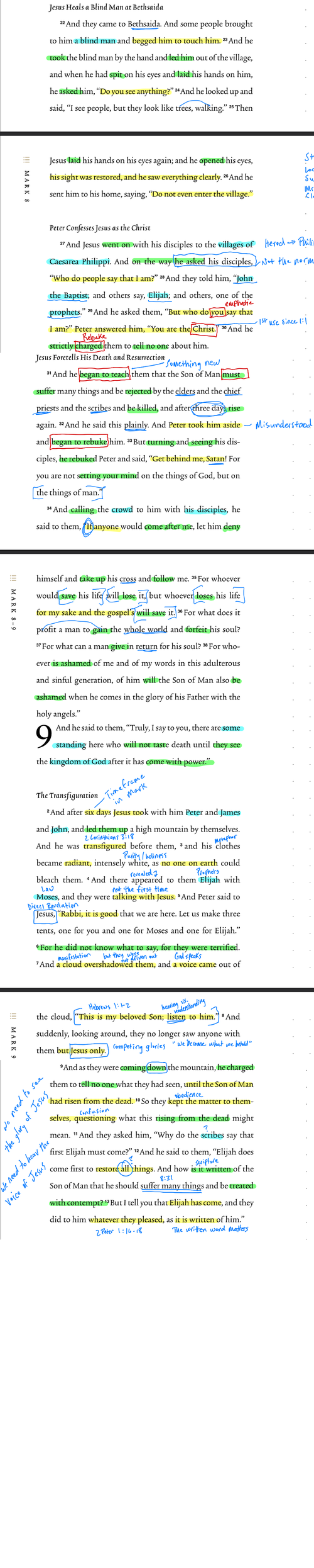 2 And after six days Jesus took with him Peter and James and John, and led them up a high mountain by themselves. And he was transfigured before them, 3 and his clothes became radiant, intensely white, as no one on earth could bleach them. 4 And there appeared to them Elijah with Moses, and they were talking with Jesus. 5 And Peter said to Jesus, “Rabbi, it is good that we are here. Let us make three tents, one for you and one for Moses and one for Elijah.” 6 For he did not know what to say, for they were terrified. 7 And a cloud overshadowed them, and a voice came out of the cloud, “This is my beloved Son; listen to him.” 8 And suddenly, looking around, they no longer saw anyone with them but Jesus only.