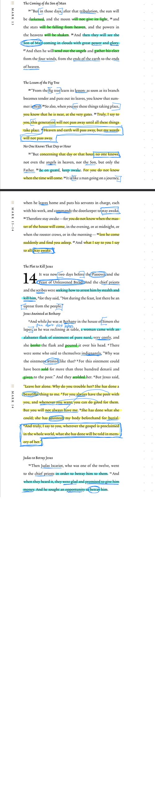32 “But concerning that day or that hour, no one knows, not even the angels in heaven, nor the Son, but only the Father. 33 Be on guard, keep awake. For you do not know when the time will come. 34 It is like a man going on a journey, when he leaves home and puts his servants in charge, each with his work, and commands the doorkeeper to stay awake. 35 Therefore stay awake—for you do not know when the master of the house will come, in the evening, or at midnight, or when the rooster crows, or in the morning— 36 lest he come suddenly and find you asleep. 37 And what I say to you I say to all: Stay awake.”