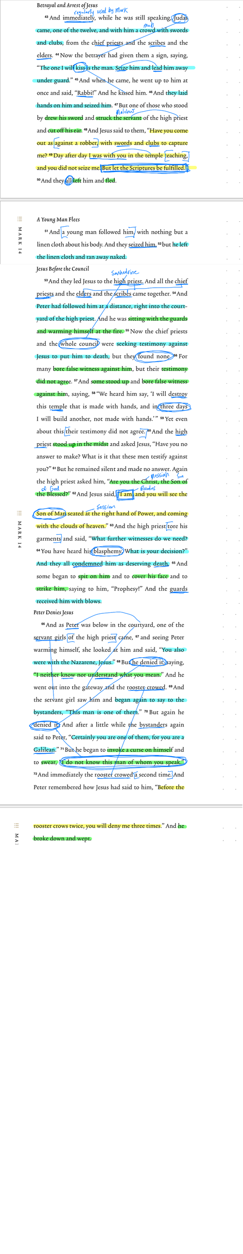 43 And immediately, while he was still speaking, Judas came, one of the twelve, and with him a crowd with swords and clubs, from the chief priests and the scribes and the elders. 44 Now the betrayer had given them a sign, saying, “The one I will kiss is the man. Seize him and lead him away under guard.” 45 And when he came, he went up to him at once and said, “Rabbi!” And he kissed him. 46 And they laid hands on him and seized him. 47 But one of those who stood by drew his sword and struck the servant of the high priest and cut off his ear. 48 And Jesus said to them, “Have you come out as against a robber, with swords and clubs to capture me? 49 Day after day I was with you in the temple teaching, and you did not seize me. But let the Scriptures be fulfilled.” 50 And they all left him and fled.