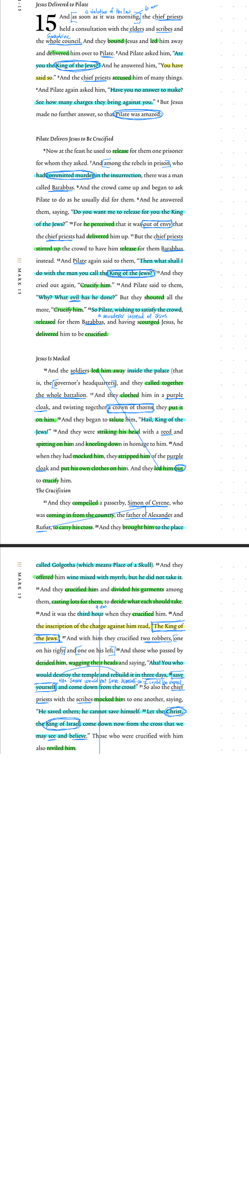 6 Now at the feast he used to release for them one prisoner for whom they asked. 7 And among the rebels in prison, who had committed murder in the insurrection, there was a man called Barabbas. 8 And the crowd came up and began to ask Pilate to do as he usually did for them. 9 And he answered them, saying, “Do you want me to release for you the King of the Jews?” 10 For he perceived that it was out of envy that the chief priests had delivered him up. 11 But the chief priests stirred up the crowd to have him release for them Barabbas instead. 12 And Pilate again said to them, “Then what shall I do with the man you call the King of the Jews?” 13 And they cried out again, “Crucify him.” 14 And Pilate said to them, “Why? What evil has he done?” But they shouted all the more, “Crucify him.” 15 So Pilate, wishing to satisfy the crowd, released for them Barabbas, and having scourged Jesus, he delivered him to be crucified.