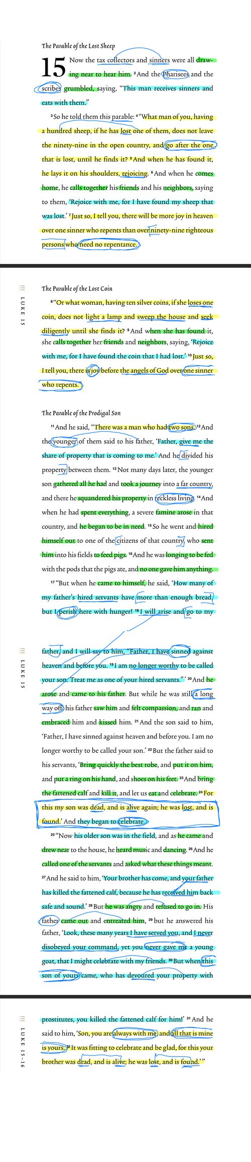 Jesus uses yet another parable in response to the criticisms of the Pharisees and scribes. Unlike the previous two parables about a lost sheep and a lost coin, this one involves two lost sons. The commonly used name "prodigal son" overlooks the important theme of the older son, who represents the Pharisees and scribes and is also lost despite living in the father's house. The father in the story divides his property between his two sons, leading to the younger son squandering his share and suffering until realizing that he would be happier serving his father than living in poverty. Upon returning home, the father, filled with compassion, meets him and welcomes him back with open arms. However, the older son is angry and refuses to join in the celebration for his younger brother. The parable ends with the older son's resentment and unwillingness to join the party. At the same time, his anger consumes him, reflecting the Pharisee's and scribes' anger towards the repentance of tax collectors and sinners.