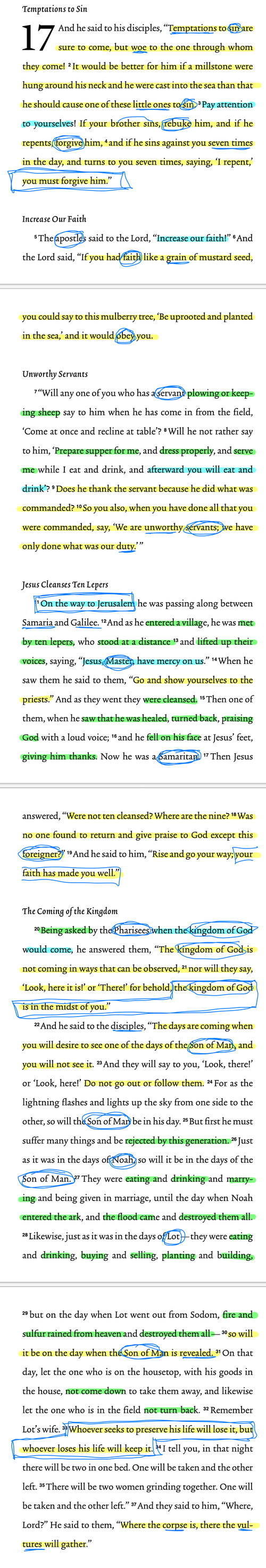 Throughout Jesus' journey to Jerusalem, he provides his disciples with guidance. In chapter 16, the danger of wealth is emphasized, and in this section, we see various teachings about discipleship that mark the end of the second stage of his journey. Jesus cautions his followers about things that can cause them to trip and the severe consequences of leading others to sin. He instructs believers to confront one another about sinful behavior and quickly forgive those who have wronged them. Perhaps due to the challenging call to forgive, the disciples ask for increased faith. However, Jesus asserts that even the smallest amount of faith can suffice. He concludes with a brief parable about a servant. After the servant completes his tasks, he prepares the master's meal and only then consumes his own. The master doesn't thank him since he's only done what is expected. Disciples mustn't expect a reward for obeying the Lord; they must remember service is its own reward.
