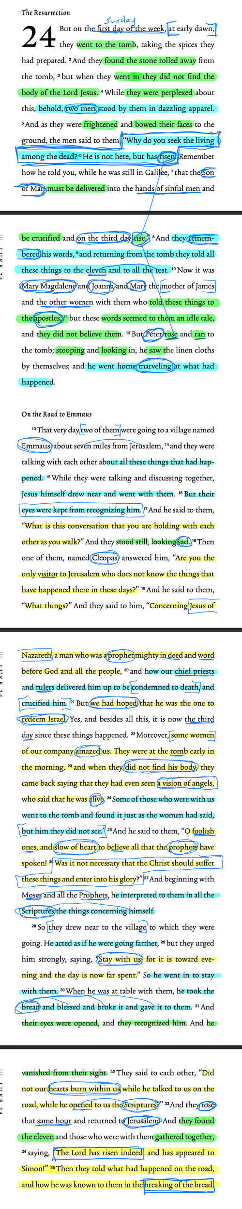 Luke tells the story of women who went to the tomb and discovered it was empty. They found that the stone had been rolled away, but Jesus was not there. The women were confused about what happened until the two angels explained that Jesus was no longer in the tomb. He had risen from the dead, which was in line with what he had foretold during his ministry – that he would suffer and rise again. The women remembered Jesus' words, and Luke emphasized that what had happened was in line with what Jesus had predicted. When the women shared what they had seen and heard, the rest dismissed it as nonsense because they didn't believe Jesus' words. However, Peter went to the tomb, saw the linen cloths, and was amazed. Peter's amazement was likely a result of his faith, not doubt, although he also had to remember what Jesus had said.