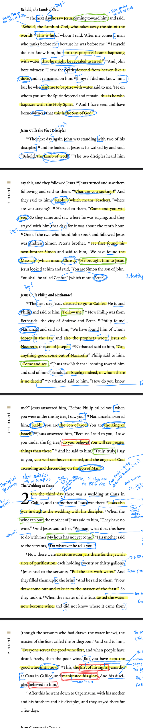 Jesus goes to a wedding on the third day, but the host runs out of wine. Jesus' mother tells him about the problem, and he asks why it concerns him. He then instructs the servants to fill six stone jars with water, draw some out and take it to the host. The host compliments the wine and calls the bridegroom. John identifies it as the first of Jesus' signs, and his disciples start to believe in him. John's account of Jesus turning water into wine emphasizes the broader significance beyond the miracle itself. The old covenant, symbolized by the marriage between Yahweh and Israel, had run its course and was depleted, as indicated by the wine running out at the wedding on the third day. Jesus made the best wine at a wedding on the third day. This illustrates that Jesus came at the right time when the old covenant had ended and the new covenant was beginning. Jesus filled the jars to the brim and provided new wine, pointing toward the new covenant. When Jesus performed a miraculous sign, his disciples believed in him (v. 11).