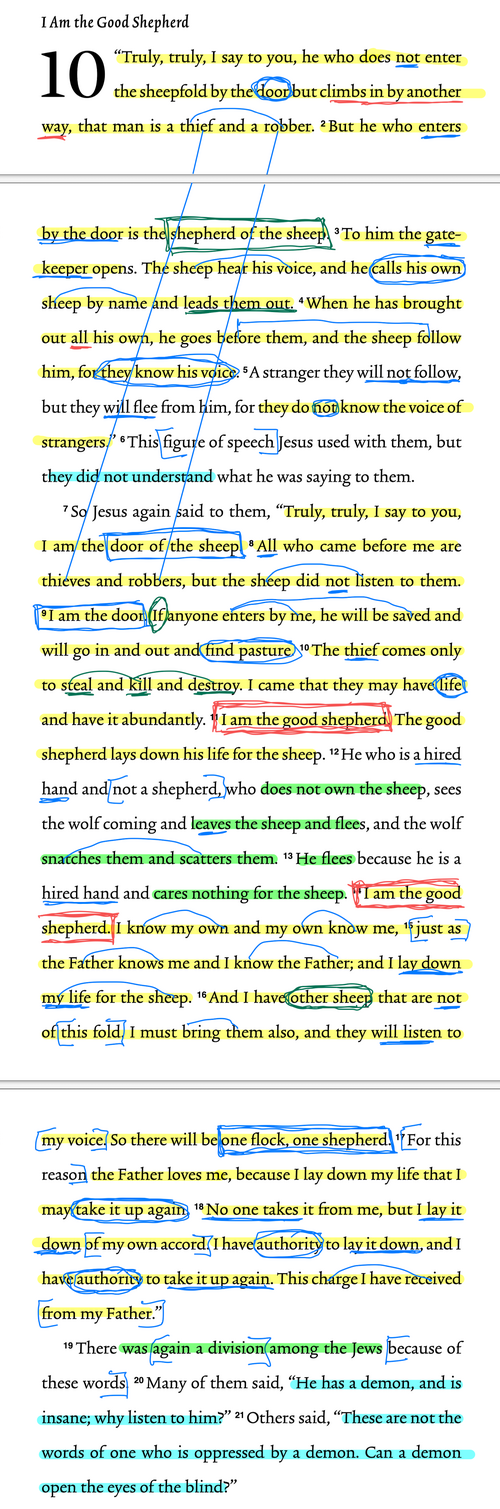 Jesus' willingness to give everything to accomplish the plan of salvation increases the love of Father for him, as he delights in and agrees with this plan. No one takes away Jesus' life as he willingly gives it. The statement "This charge I have received from my Father" at the end of verse 18 refers to Jesus's authority to lay down his life and take it up again. Those who see and hear are experiencing Jesus' calling them to himself.