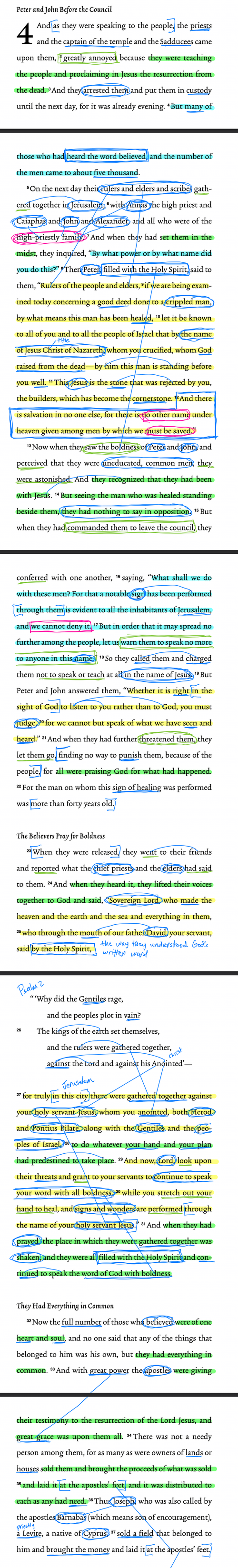 When Peter and John share their encounter with the priests and elders, the Jerusalem Christians respond by praying and praising God. They refer to God as the creator and the "Sovereign Lord," which is Yahweh, the one covenant God. The biblical understanding of sovereignty refers to God's fulfillment of his eternal divine plan, which gives believers assurance and hope. The belief is that individuals are accountable for their sins and that the gospel message of forgiveness through Jesus is the only way people can be saved. This understanding of sovereignty inspires their preaching, as they accept God's will and the methods by which it will be accomplished. Even though the council is making threats, the community is not praying for divine judgment. Instead, they are determined to keep spreading Jesus' message and relying on God to help them do it. The power of the Spirit is so strong that the physical sensation of an earthquake is felt in the building.