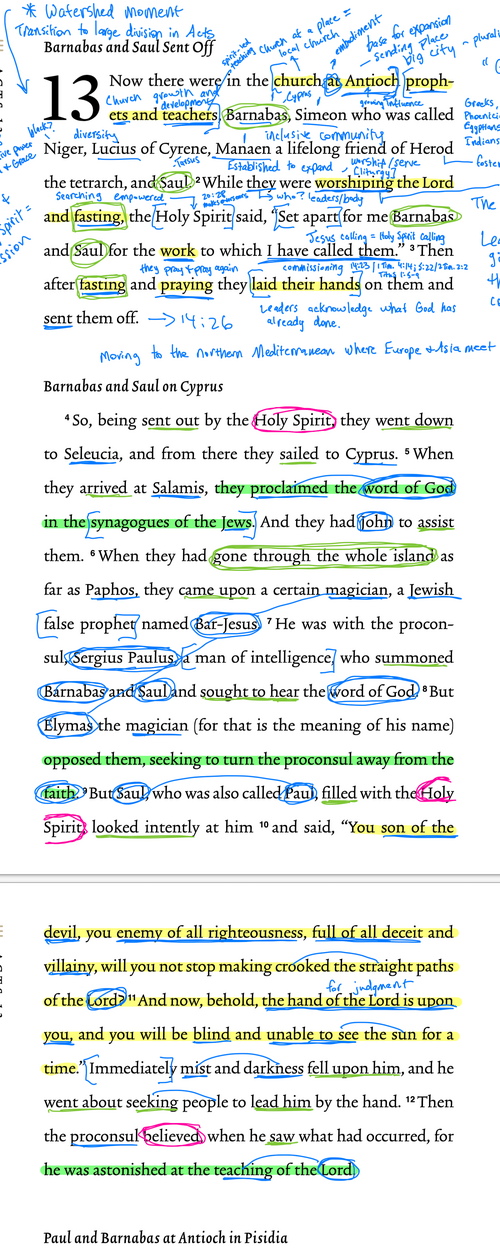 In chapter 13, the church leaders at Antioch are introduced, including prophets and teachers. Despite being a diverse group, they are united in the Spirit, and the predominantly Gentile church shows remarkable unity and purpose, despite previous struggles with Gentile inclusion. The group is worshiping and fasting when the Spirit instructs them to send Saul and Barnabas on a mission (v. 2). After receiving guidance from the Spirit, the people in Antioch fast and pray again, this time to prepare for the upcoming journey. They lay their hands on Saul and Barnabas to commission them for the task. Commissioning events similar to the laying on of hands occur with fasting and prayer, but the primary purpose of this gesture is to recognize and commission someone for service. Luke again emphasizes that Barnabas and Saul are sent out by the Holy Spirit, even though they have been commissioned.