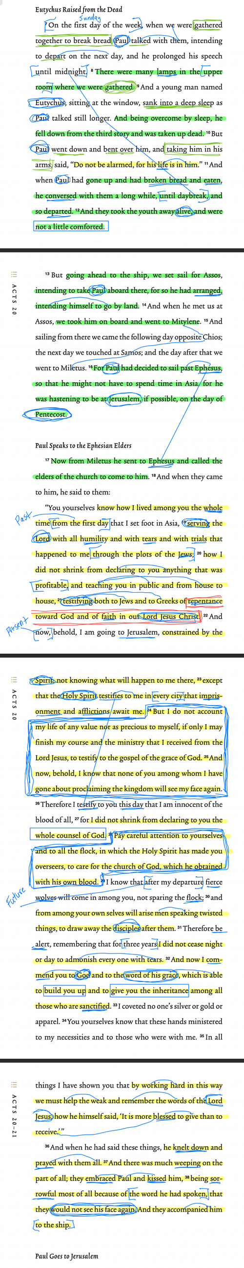 In Miletus, Paul summons the "elders" from Ephesus to meet with him (v. 17). He first reminds them about his manner of living during his ministry throughout Asia (v. 18). Paul's purpose is not to complain or seek pity, but to explain to the elders why he endured such hardships - for the sake of spreading the gospel. Paul confirms his plan to go to Jerusalem and explains that he is confident of this decision because he is being guided by the Holy Spirit (20:22). Although it is not clear how the Spirit has communicated with him, Paul is determined to follow this mission instructed by the Spirit, even if it means facing challenges. Ultimately, he is committed to obeying God.