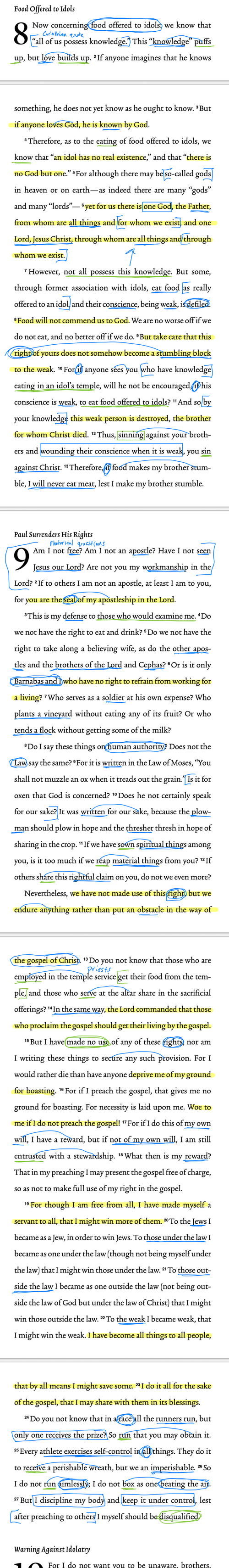 Similarly, Old Testament priests who served in the temple and at the altar had the right to partake of the offerings (Deut. 18:1–5). Likewise, Paul, as a preacher of the gospel, has the right to earn his living solely from his preaching, as Jesus himself taught. Yet, Paul willingly chooses not to exercise this right, for he does not want to forfeit his opportunity to "boast" in a different way, namely, to "present the gospel free of charge." By limiting the exercise of his rights as a gospel preacher, Paul demonstrates his wholehearted commitment to proclaiming the gospel.
