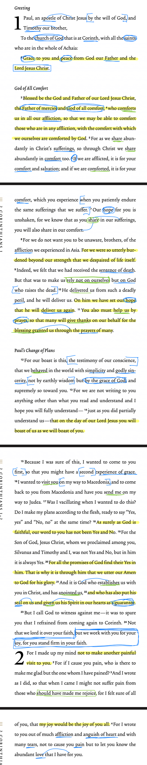 What are the capabilities of the Corinthians? By offering their prayers, the Corinthians are partnering with Paul to spread the gospel across the Mediterranean during the crucial early years of the church's growth. Paul intentionally resisted the tendency of conforming to worldly strategies, which the Corinthians admired and absorbed, and instead relied on the grace of God for his work. When human ingenuity and self-made plans reach their limits, that's where grace takes over.