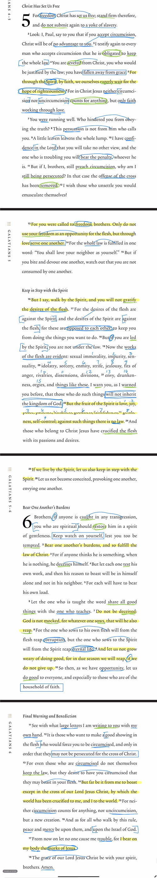 During theological debates in Galatia, a competitive atmosphere emerged. Paul warns against pride, envy, and discord, which hinder walking in harmony with the Spirit and manifesting its fruit. Instead, he envisions believers diligently restoring one another, bearing burdens, and loving their neighbors. Boasting should only be in the cross of Christ. Paul emphasizes honest self-evaluation, as the final judgment matters more than comparing oneself to others. He advocates for supporting church leaders and using resources for God's purposes. Believers, united by faith, form a family. In his handwriting, Paul emphasizes key points, addressing false teachers who impose stricter adherence to the law on others.