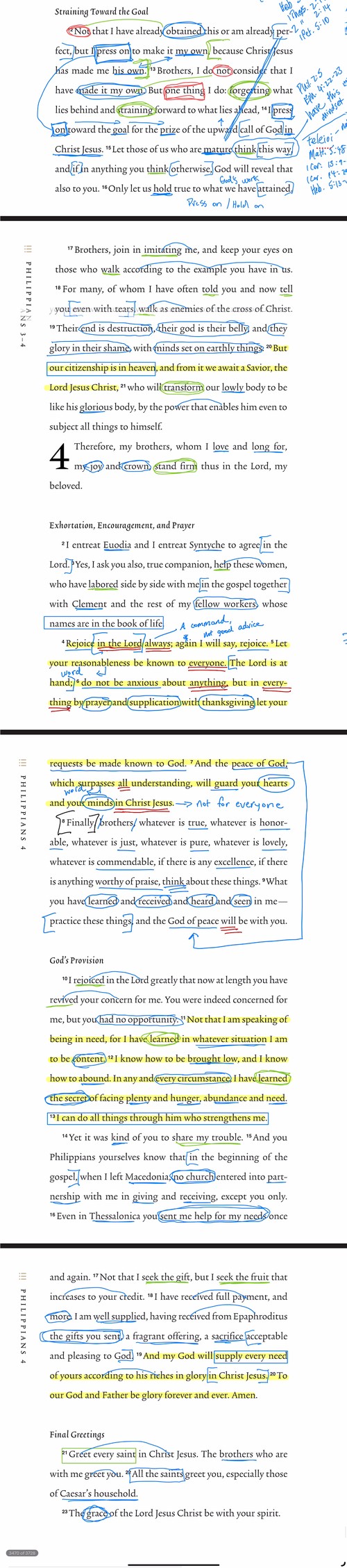 Paul expresses his affection for the Philippians in various ways. He refers to them as "brothers," expresses love and longing for them, considers them his joy and crown, and calls them "beloved." These expressions of affection enhance his exhortation for them to stand firm in the Lord. Although the details of the conflict between two women are unknown, Paul mentions their names and acknowledges their work in the gospel. He urges a faithful companion to help reconcile them, emphasizing that they should be able to reconcile since they worked together for the gospel. The mention of their names being in the book of life suggests that they should shine for the Lord together instead of disputing. Paul commands the Philippians to rejoice always, regardless of circumstances, and to exhibit gentleness and kindness even towards opponents. He urges them not to be anxious but to pray about everything, with an attitude of gratitude, knowing that God is for them.